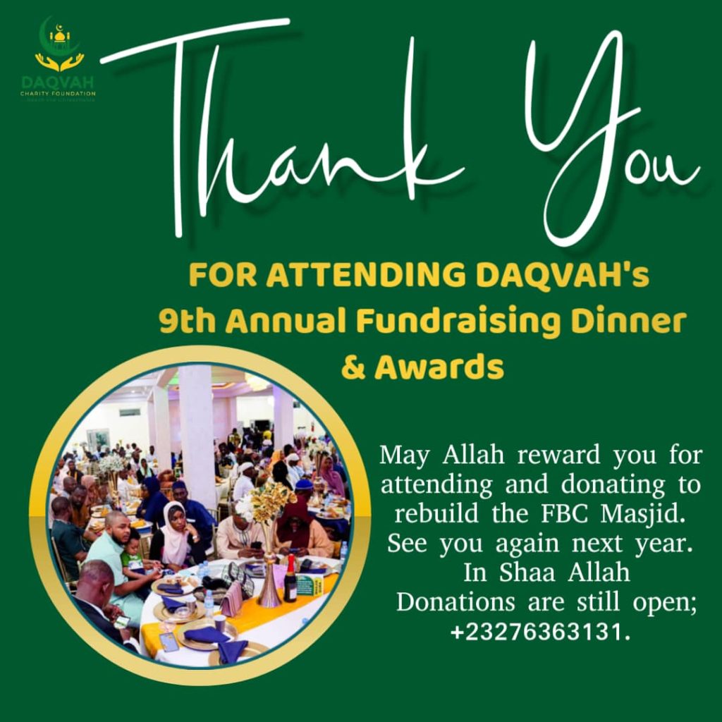 Alhamdulillah! On behalf of Management, staff and members of DAQVAH, I take the honor of saying Jazakallahu Khairan to all attendees and donors of DAQVAH’s 9th Annual Fundraising Dinner. We appreciate your time, energy and donations towards the rebuilding of the FBC Masjid Project. We ask Allah to bless abundantly all those who donated and to provide more for all those who made pledges so they can fulfill their pledges soonest.