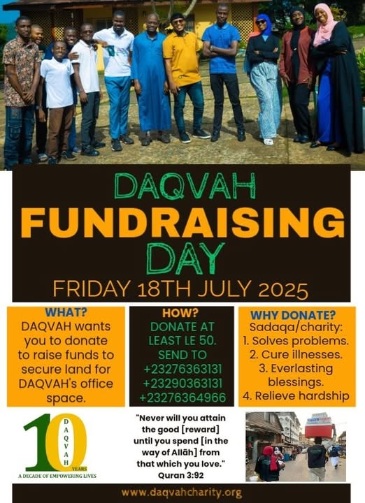 Yes, the DAQVAH Charity Foundation is organizing a fundraising day to mark its 10 year of existence. And DAQVAH is calling on all its over 6,000 members and the Muslims in Sierra Leone to donate at least Le 50 ($2.1) this Friday 18th July, for the purpose of securing land to construct DAQVAH office. Let’s be determined and yes we can do it as Sierra Leonean Muslims.